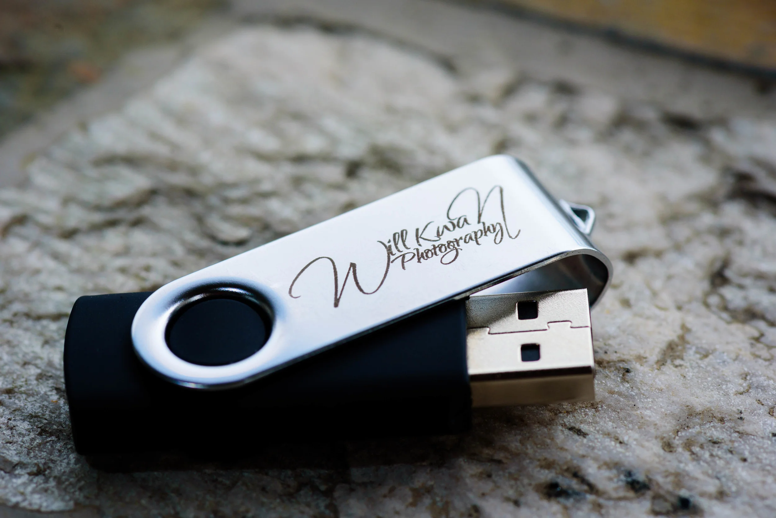 As a Wedding Photographer, delivering final, full size images to clients can sometimes turn into a difficult task. More and more computers these days do not come with DVD drives and the need to download and store the images can sometimes be a pain in the neck! Alongside my Online Gallery, I am please to offer my custom USB flash drive to my clients as a way to deliver my final work! These bad boys will store all your images of the day, including Engagement and Photo Booth images as well. Good bye and good riddance, DVD discs!